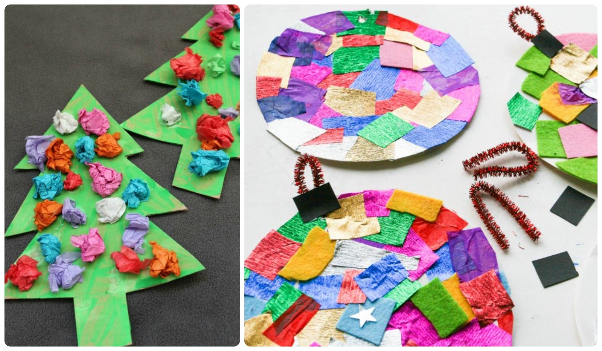 ❤️Sigur le-a rămas copiilor destulă energie şi pentru alte decoraţiuni de Crăciun. Aşa că vă propunem brăduţi şi globuri decorate cu hârtie creponată. Sunt simplu de făcut, într-o mulţime de variante vesele şi colorate. (cum se realizează, vedeţi aici şi aici)
