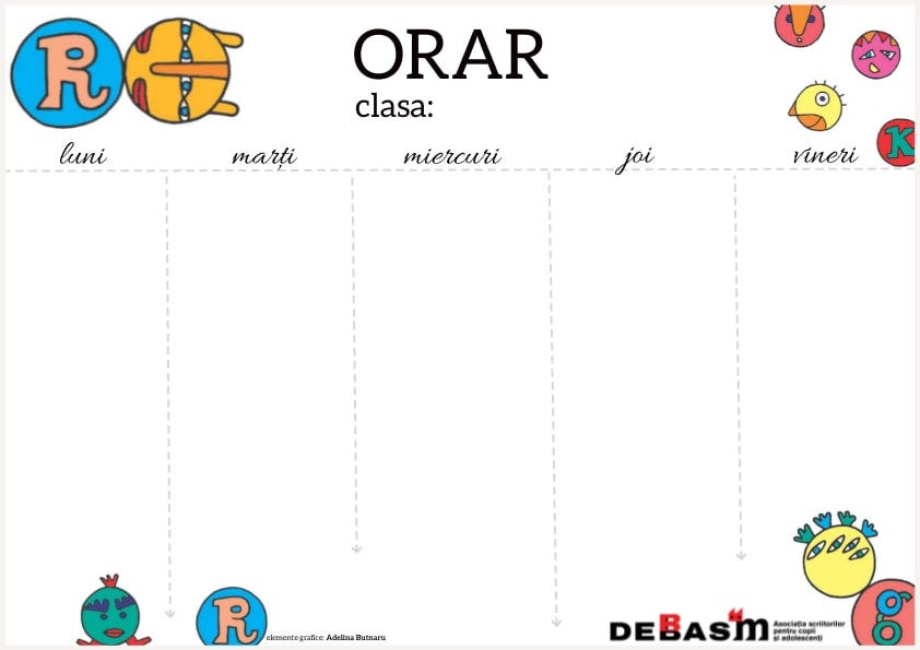 Pentru un început de şcoală colorat, vă propunem un orar vesel, care poate fi imprimat uşor. Doar daţi click pe imagine şi se va deschide într-un format pdf, uşor de multiplicat şi de împărţit tuturor copiilor din clasă.